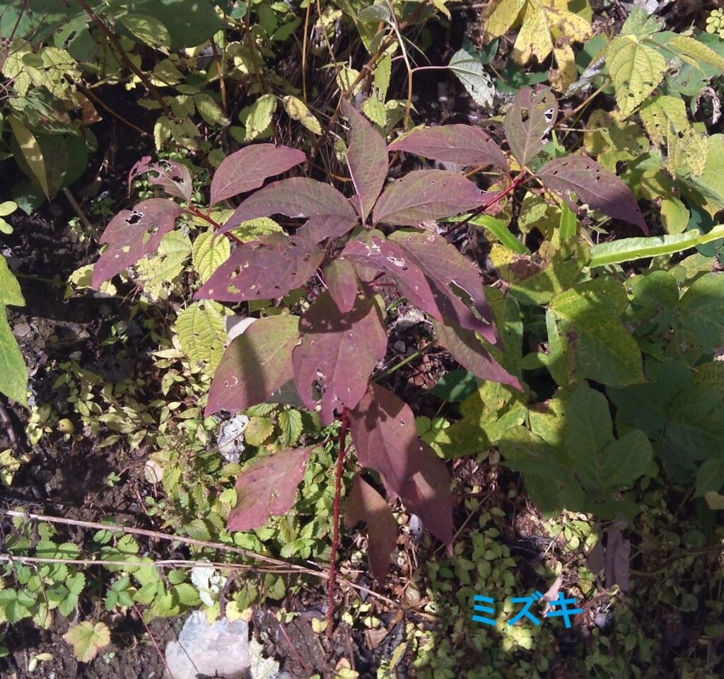 赤みがかった枝が「ミズキ」の幼樹っぽいけど、葉が全然違う。