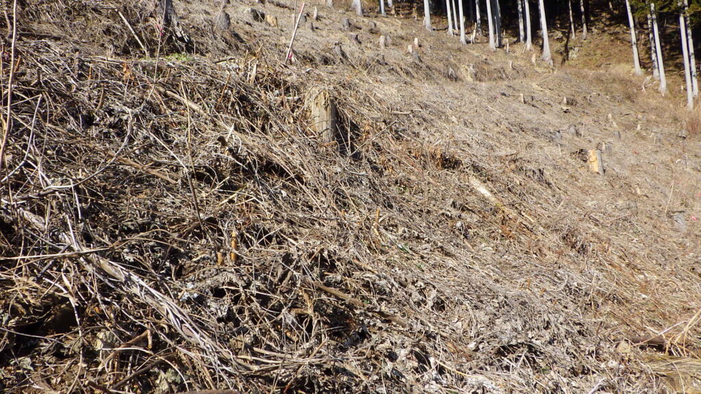 せっかく生えていた幼樹も、クズに巻かれて枯らされるかナギ倒されるかで、まばらにしか残っていません。